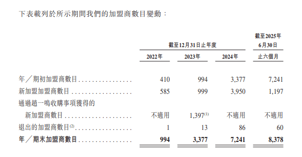 截至2022年、2023年和2024岁暮以及2025年6月末,加盟商数目别离为994家、3377家、7241家、8378家;退出加盟商的数目别离为1家、13家、86家、60家;新添加盟商的数目别离为585家、999家、3950家、1197家,此中2025年上半年新添加盟商不脚客岁全年新添加盟商的三分之一。