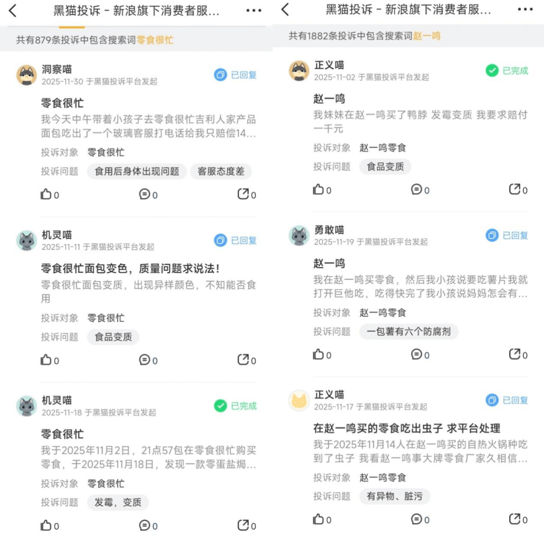 “我于2025年11月2日正在零食很忙采办零食,11月18日发觉一款零蛋盐焗鹌鹑蛋过时发霉,还有别的几个商品发觉发霉变质,商家说退一赔一,我不接管!面包还正在保质期内,拆开食用时也发觉发霉了”。一位消费者赞扬称。“鬼称”事务也常被赞扬,另一消费者说道,“本人正在零食很忙益阳安化水韵山城店采办零食,所有的称沉零食都不准,最离谱的一包鱿鱼现实分量34克,发卖小票上139克,四倍差额分量”。还有消费者赞扬“赵一鸣”。“我于2025年11月14日正在赵一鸣买的自热暖锅中吃到了虫子 。我看赵一鸣是大牌零食厂家相信他,没想到卫生不克不及保障,求平台处置赵一鸣也做出回应”。国度企业信用消息公示官网显示,鸣鸣很忙旗下的多家加盟店遭到行政惩罚,有的门店是尚未取得食物运营许可便处置食物运营勾当,有的门店则是运营标签不合适的速冻食物,还有的门店是由于发卖过时零食则被惩罚。2024年5月,高安市市场监管局传递赵一鸣零食瑞阳东区店发卖的“玫瑰鱼(喷鼻辣味)”产物,因超范畴利用苯甲酸及其钠盐,不合适食物平安国度尺度,被处以违法所得和罚款。2024年8月,赵一鸣零食正在三天时间里被监管部分两次点名产物不及格。正在广东省市场监视办理局披露关于13批次食物不及格环境的布告中,有2批来自赵一鸣零食店。两天后,市场监管局再次披露一则关于18批次食物不及格环境的布告,此中再次呈现了赵一鸣零食店的身影。