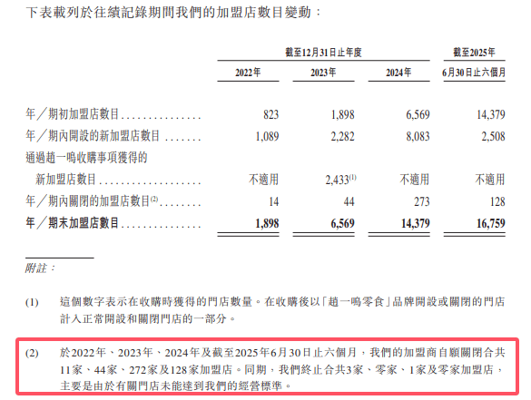 这也从而导致鸣鸣很忙的闭店率显著攀升。招股书显示,截至2022年、2023年和2024岁暮以及2025年6月末,加盟商志愿封闭合共11家、44家、272家及128家加盟店。同期,公司终止合共3家、1家及零家加盟店,次要是因为相关门店未能达到运营尺度。