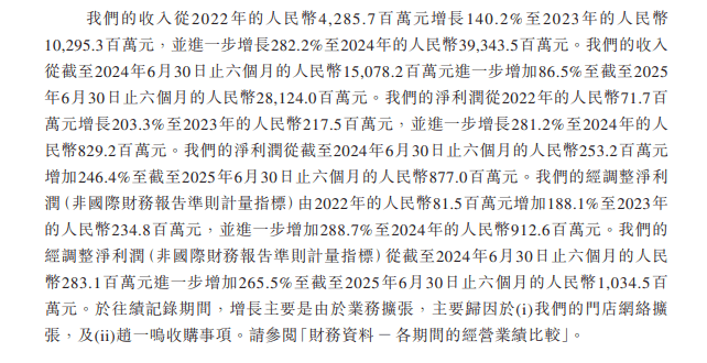2024年,鸣鸣很忙录得商品买卖总额(GMV)555亿元,到2025年上半年录得GMV约为411亿元,较2024年同期增加86。9%。按此数据计,鸣鸣很忙是中国最大的连锁零售商,亦是中国第四大连锁零售商。跟着行业规模敏捷攀升,鸣鸣很忙实现了业绩狂飙。2022年、2023年、2024年及2025年上半年,鸣鸣很忙实现停业收入别离为42。86亿元、102。95亿元、393。44亿元、281。24亿元,经调整的利润净额别离为0。81亿元、2。35亿元、9。13亿元、10。34亿元。